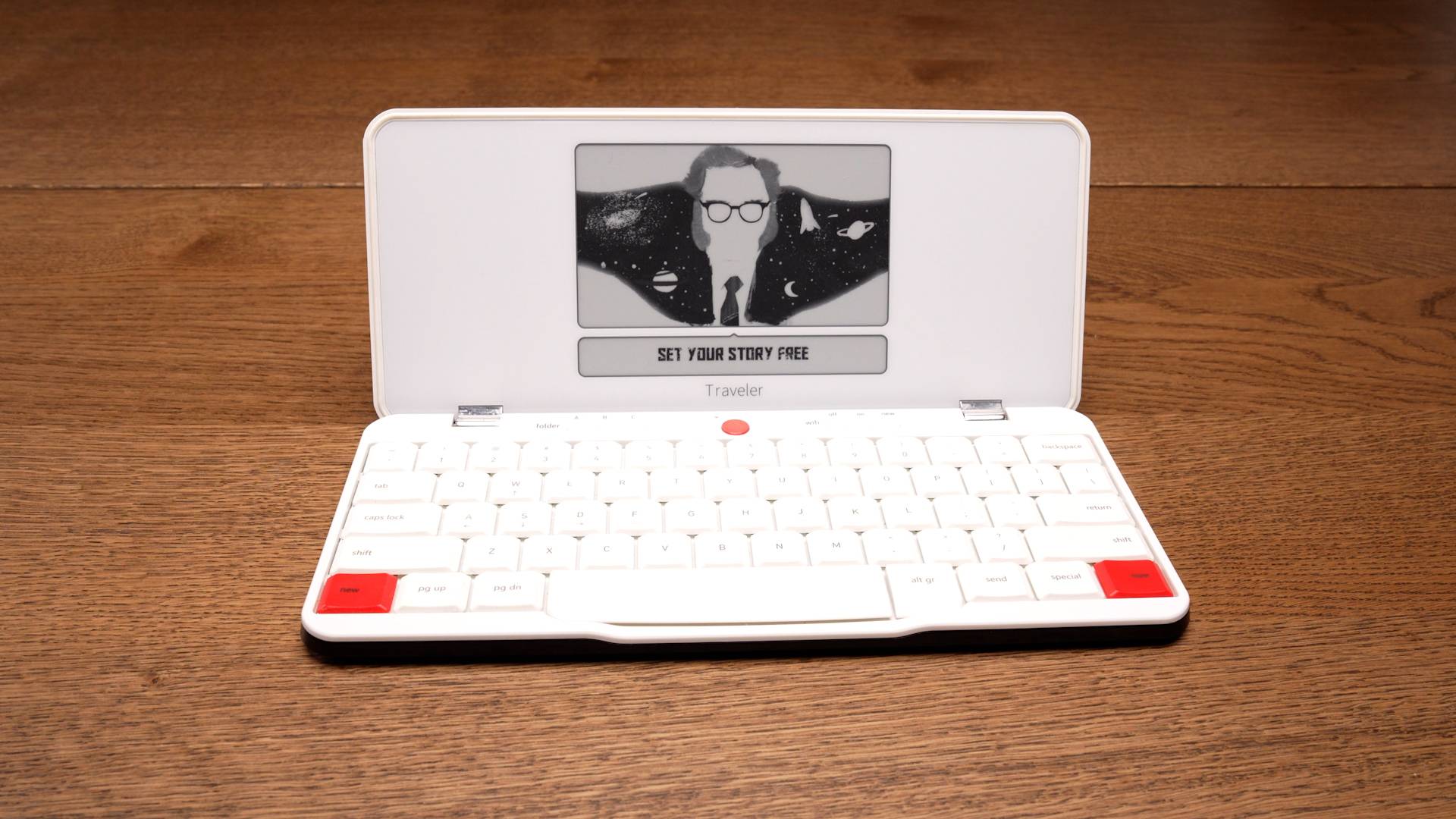 A portable clamshell writing device with a solid keyboard and crisp E Ink display.